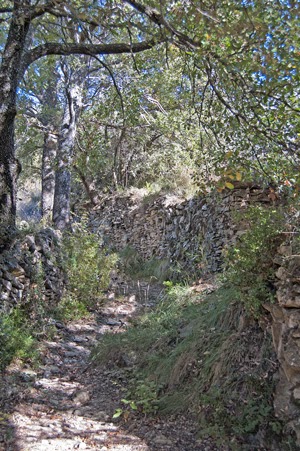 Superamos un alto y, tras pasar entre unos muros de piedra que delimitaban espacios de cultivo y de paso, llegamos a Cheto. Es una aldea próxima a Rodellar. Allí encontramos a un perro que se sorprende tanto o más que el que esto escribe y, como no podía ser de otra manera, el dueño que camina tras él presenta un claro acento francés cuando nos indica cómo llegar a Rodellar. Simplemente hay que tomar el camino que dirige a la ermita de San Lorenzo.